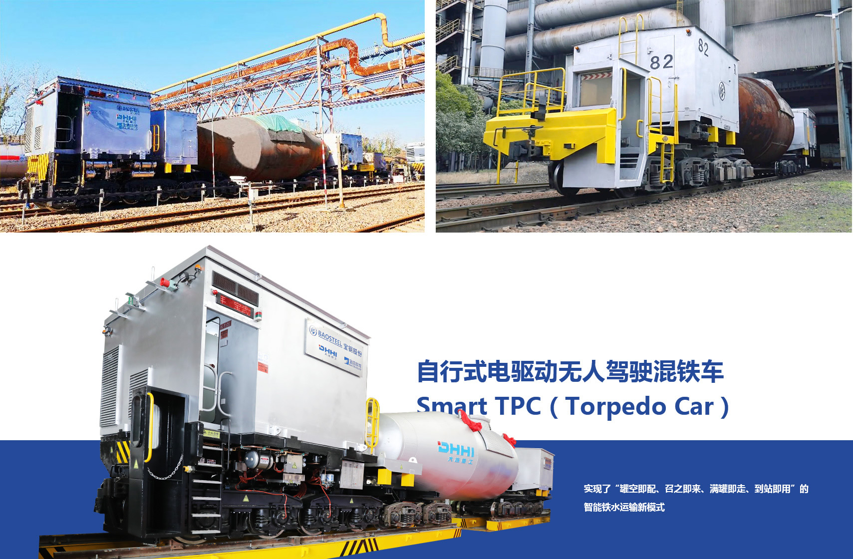 自行式電驅動無人駕駛混鐵車Smart TPC(Torpedo Car)是一種綠色、智能、高效的鐵水運輸設備,采用自動駕駛,純電力驅動,實現(xiàn)了“罐空即配、召之即來、滿罐即走、到站即用”的智能鐵水運輸新模式,可智能、綠色、高效地完成從高爐到煉鋼的鐵水運輸作業(yè)。