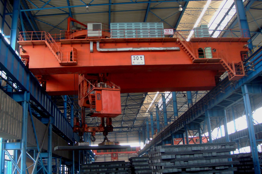 板坯夾鉗起重機(又稱板坯搬運起重機)是搬運板坯特別是高溫板坯的專用設備。大連重工研制的板坯夾鉗起重機有四大類,分為:板坯夾鉗、鋼板夾鉗、鋼卷夾鉗、鋼錠夾鉗,共十幾種機型,規(guī)格包括:20t、30t、36t、40t、45t、50t、56t、63t、70t、94t、100t 。