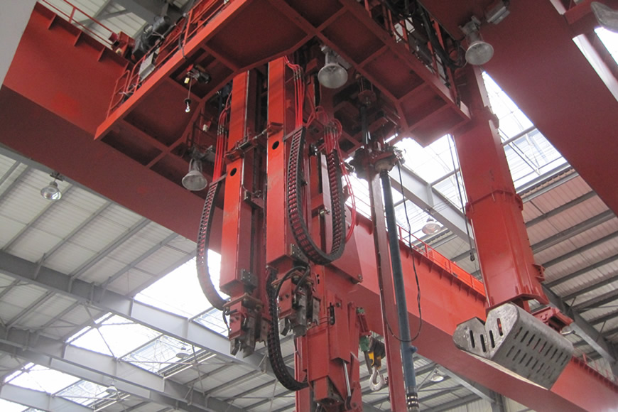 鋼錠夾鉗起重機是將冷鋼錠裝入均熱爐或將加熱完成的紅熱鋼錠從爐中取出的起重設備。大連重工研制的鋼錠夾鉗起重機規(guī)格包括:20t、40t、45t、60t、65t。