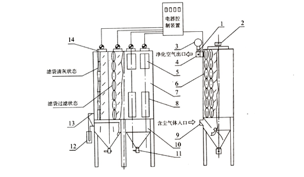 含塵氣體由進(jìn)氣管進(jìn)入灰斗,再向上經(jīng)由箱體內(nèi)的濾袋凈化后,由電動(dòng)三通閥開啟的主閥板處排至出氣管,出氣管的氣體再經(jīng)離心風(fēng)機(jī),煙囪排入大氣中。
