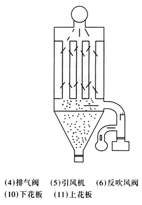 該除塵設備由含塵氣體入口至凈化煙氣出口,本體結構由進氣管路、進氣室、袋室、灰斗、排灰閥、出口管道及反吹風系統和清灰控制系統所組成。