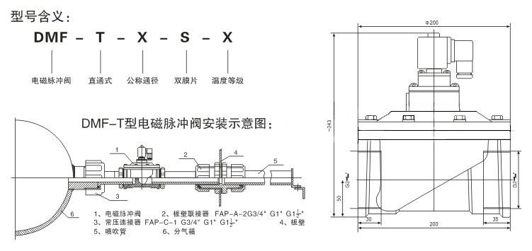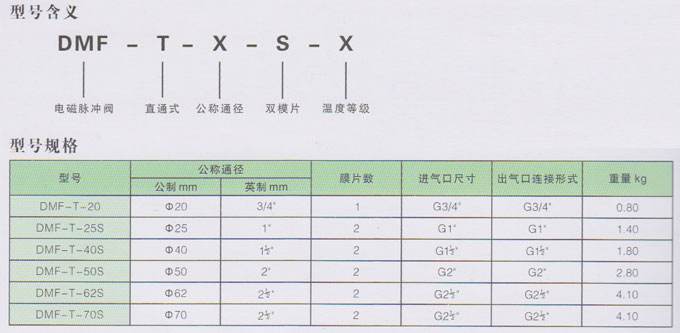 DMF-T型電磁脈沖閥為直通閥,其進(jìn)氣口之間夾角為180°(進(jìn)出口中心線為同一直線),其進(jìn)口與儲氣筒連接,出口與噴吹管連接。氣流暢通,能提供符合要求的清灰氣脈沖。